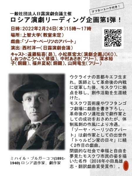 2022年2月24日(木)にロシア演劇リーディング企画第一弾を上智大学との共催で開催します。日本であまり知られていないロシア演劇の話題作をプロの俳優によるリーディングを通して紹介します。第一弾ではミハイル・ブルガーコフの代表作「ゾーヤ・ペーリツのアパート」(初演1926年10月28日、ワフタンゴフ劇場)を西村洋一(日露演劇会議)による演出でお送りします。